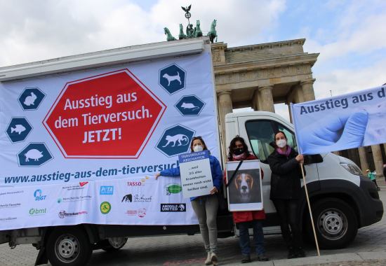 Insbesondere im Jahr der Bundestagswahl forderte unser Kampagnen-Bündnis „Ausstieg aus dem Tierversuch. JETZT!“ am 24. April von den politischen Parteien, einen Masterplan in ihre Wahlprogramme aufzunehmen. Unsere AGs und befreundete Vereine und Gruppen organisierten in 12 Städten Aktionen und trugen unsere Forderung in die Öffentlichkeit. Aktivitäten gab es: in Augsburg, Berlin, Düsseldorf, Erlangen, Frankfurt/M., Gütersloh, Hamburg, Heidelberg, Karlsruhe, Köln, Münster, Offenburg sowie virtuell über Zoom das Theaterstück „Irre ist menschlich“.