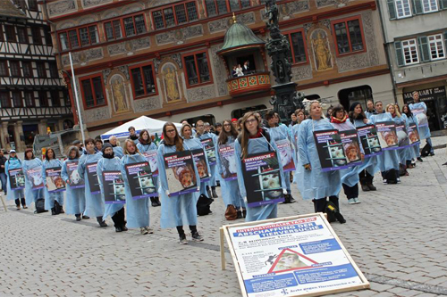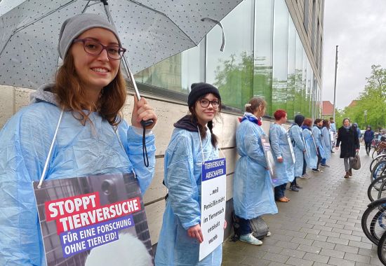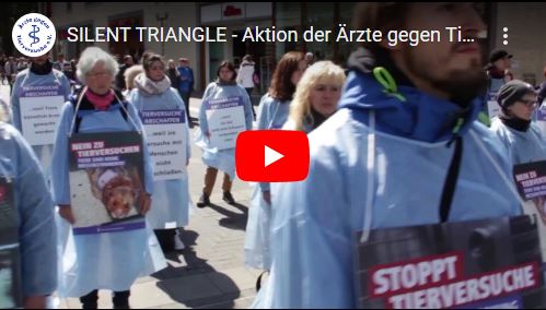 Am 22. April 2017 haben wir eine eindrucksvolle stille Protestaktion in München, Münster und Tübingen veranstaltet. Diese drei Städte stehen als Symbol für das Leid der Affen und aller Tiere in den Laboren. Schweigend, wie ein Mahnmal haben wir in OP-Kittel gekleidet mit Schildern in Form eines Dreiecks gestanden und die Macht der Bilder und Texte auf die Passanten wirken lassen.