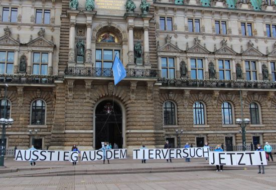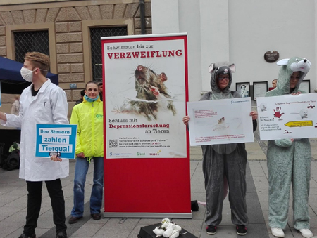 Am 27. April 2019 organisierten wir mit unseren AGs stille Protestaktionen in Erlangen, Hamburg und Heidelberg. Diese drei Städte stellten wir in den Fokus, da sie als Symbol stehen für Tierversuche mit Schweregrad „schwer“, deren Verbot wir ja mit unserer Kampagne „Schwimmen bis zur Verzweiflung“ erreichen wollen. Doch auch andernorts stieß unser Aufruf für den 27. April als Aktionstag auf Echo, und unsere Arbeitsgruppen sowie befreundeten Vereine gingen auf die Straßen in Bayreuth, Berlin, Bremen, Duisburg, Gütersloh, München, Münster, Kehl, Saarbrücken und Stuttgart.