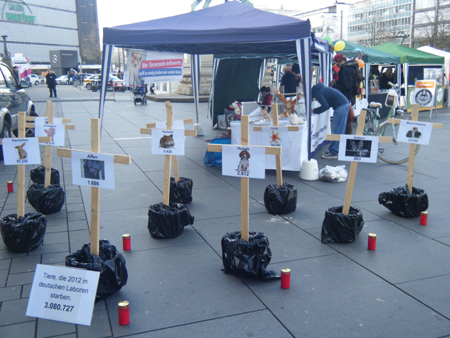 2013 haben wir erstmals bundesweit zu lokalen Aktionen aufgerufen, um möglichst viele Menschen zu erreichen. Es gab 28 Aktionen wie Mahnwachen, Infostände, Ausstellungen und Vorträge in 22 Städten! Mit tollen kreativen Aktionen konnte so einer breiten Öffentlichkeit gezeigt werden, wie grausam und unsinnig Tierversuche sind. Viele Lokalmedien berichteten positiv. Am 20.4.2013 fand zudem in Berlin eine zentrale Demo statt, organisiert vom Bündnis Tierschutzpolitik. Mehr als 1.500 Menschen zogen, ausgerüstet mit Schildern, Transparenten und Trillerpfeifen, vom Brandenburger Tor zum Alexanderplatz und forderten die Abschaffung aller Tierversuche.